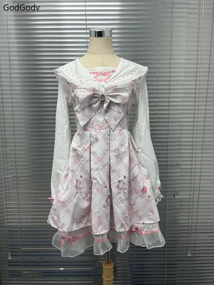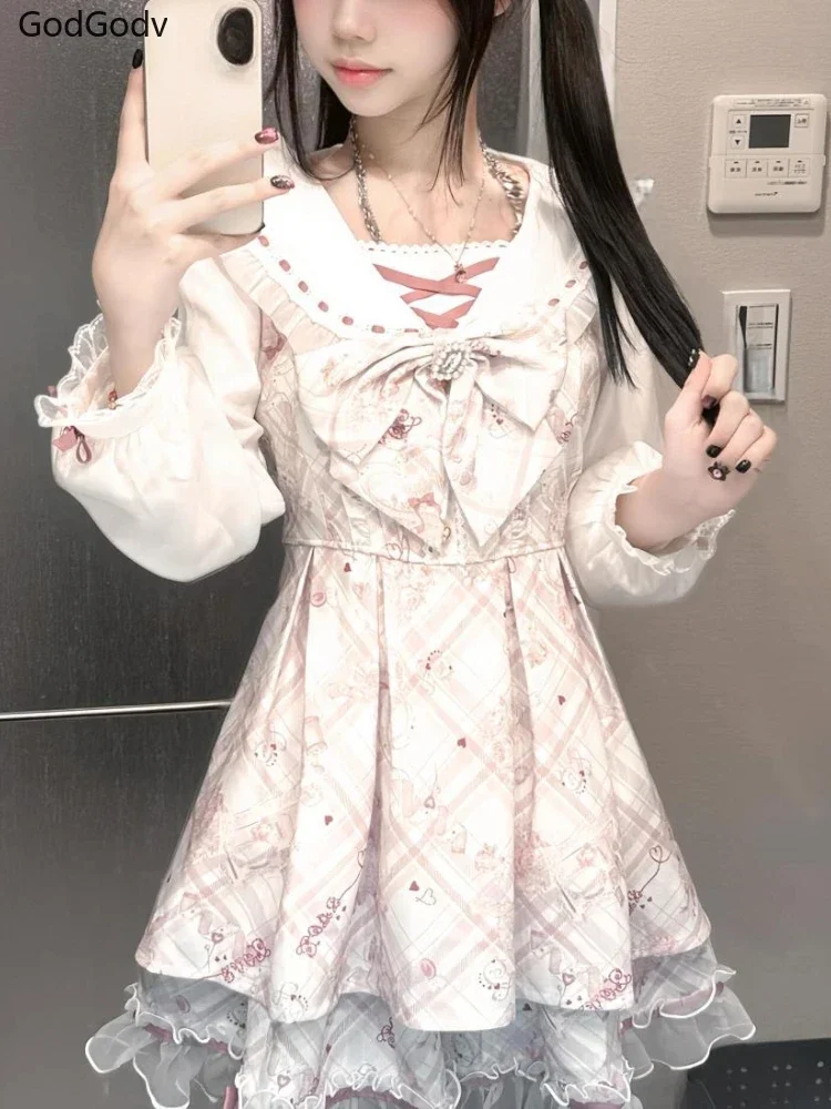 2025 Japanese Sweet Lolita Kawaii Dress Women Spring Printed Bow Fake Two Piece Dress Female Korea Style Design Party Clothing